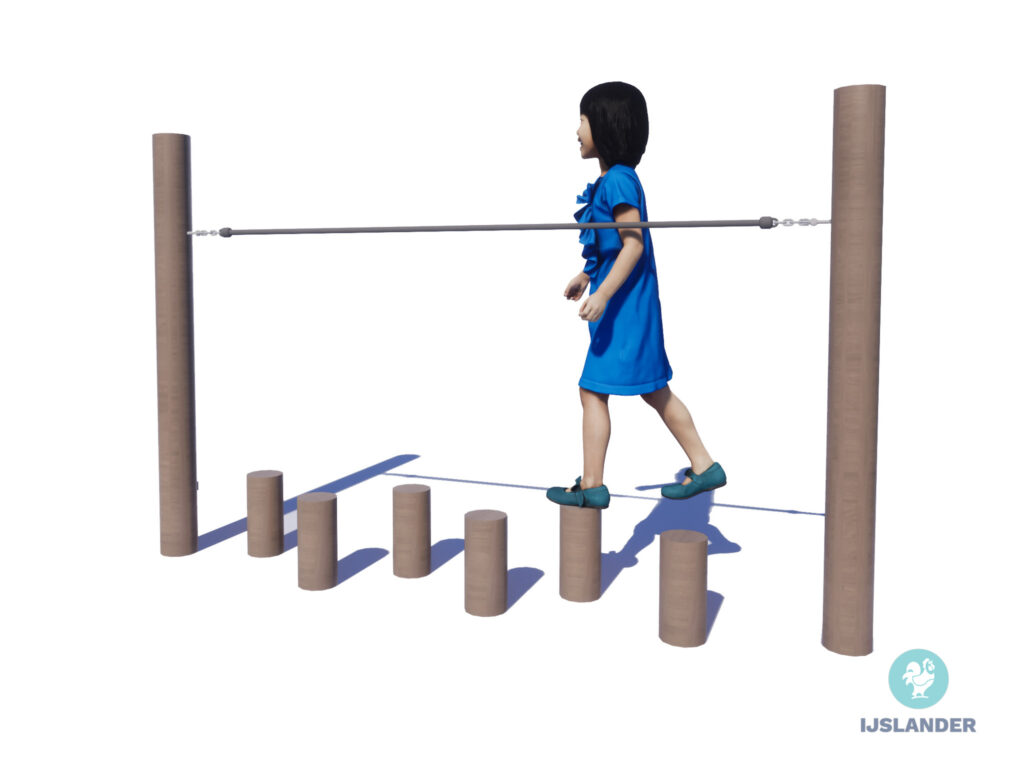 Op deze Kupa Max balanceerbrug kun je van de ene naar de andere kant balanceren over de stappalen. Je kunt je vasthouden aan het gespannen touw voor extra steun. Het is een ideale plek om je balans te oefenen en je grenzen te verleggen.