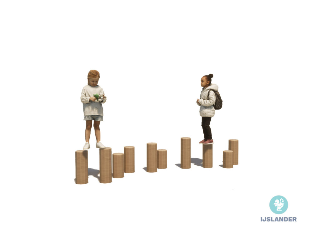 Oefen je balans met de houten balanceerpalen. Voorzichtig aan de hand van iemand anders stappen van de ene naar de andere paal. Of, als het makkelijk gaat, zo snel mogelijk naar de andere kant!
