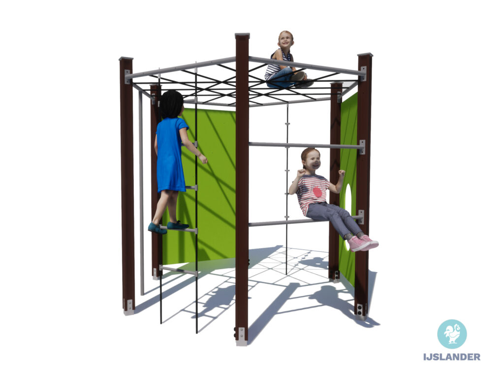 De Tino Fuchsia is een mooi, compact klimtoestel. Je kunt op verschillende manieren klimmen en klauteren; van een trap tot een klimwand. Niks houdt jou tegen om op het net bovenin het toestel te klimmen en daarna glij je als een ware acrobaat via de stang naar beneden.