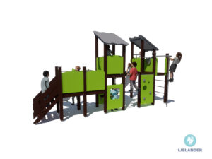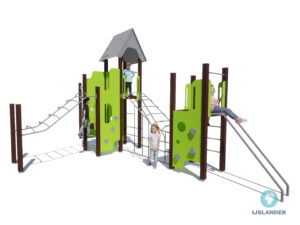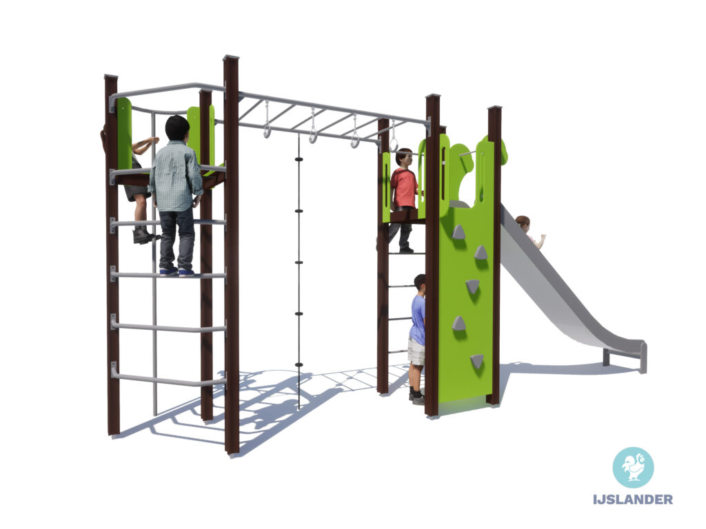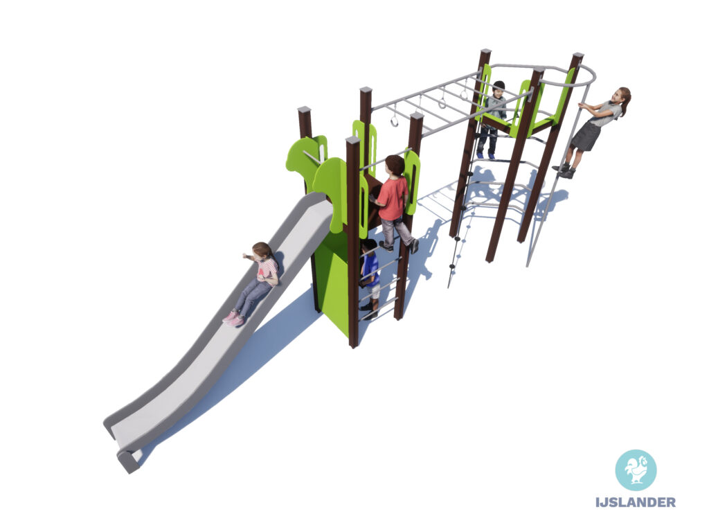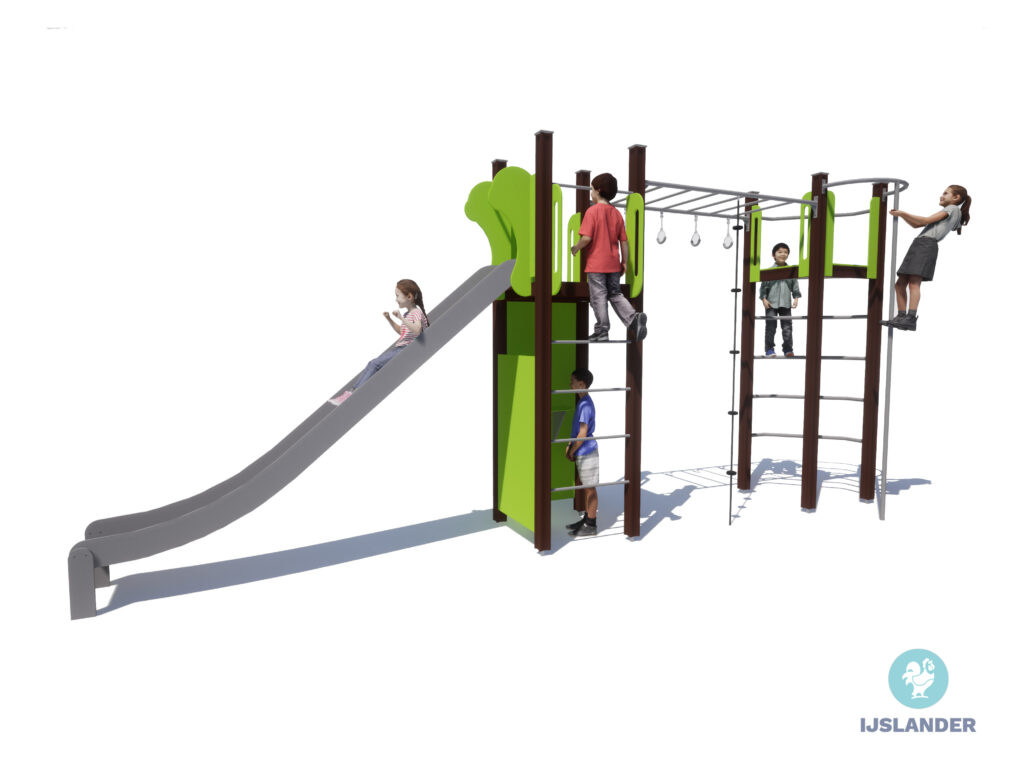 Dit toestel heeft veel! De Tino Iris geeft je alle ruimte tot klimmen en klauteren om vervolgens van de glijbaan af te roetsjen. Even wat anders? Onder de glijbaan is een leuk hoekje gecreëerd.