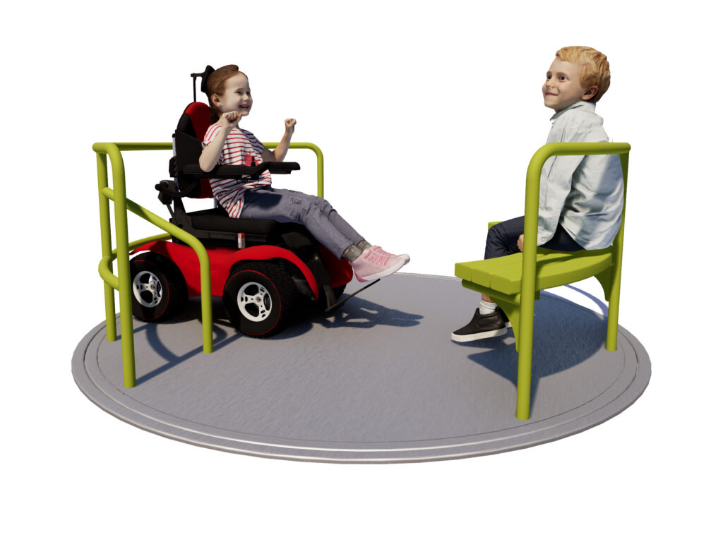De carrousel met rolstoelopgang is geschikt voor iedereen, met of zonder rolstoel. Samen draaien en spelen. Durf jij heel veel rondjes mee te draaien?
